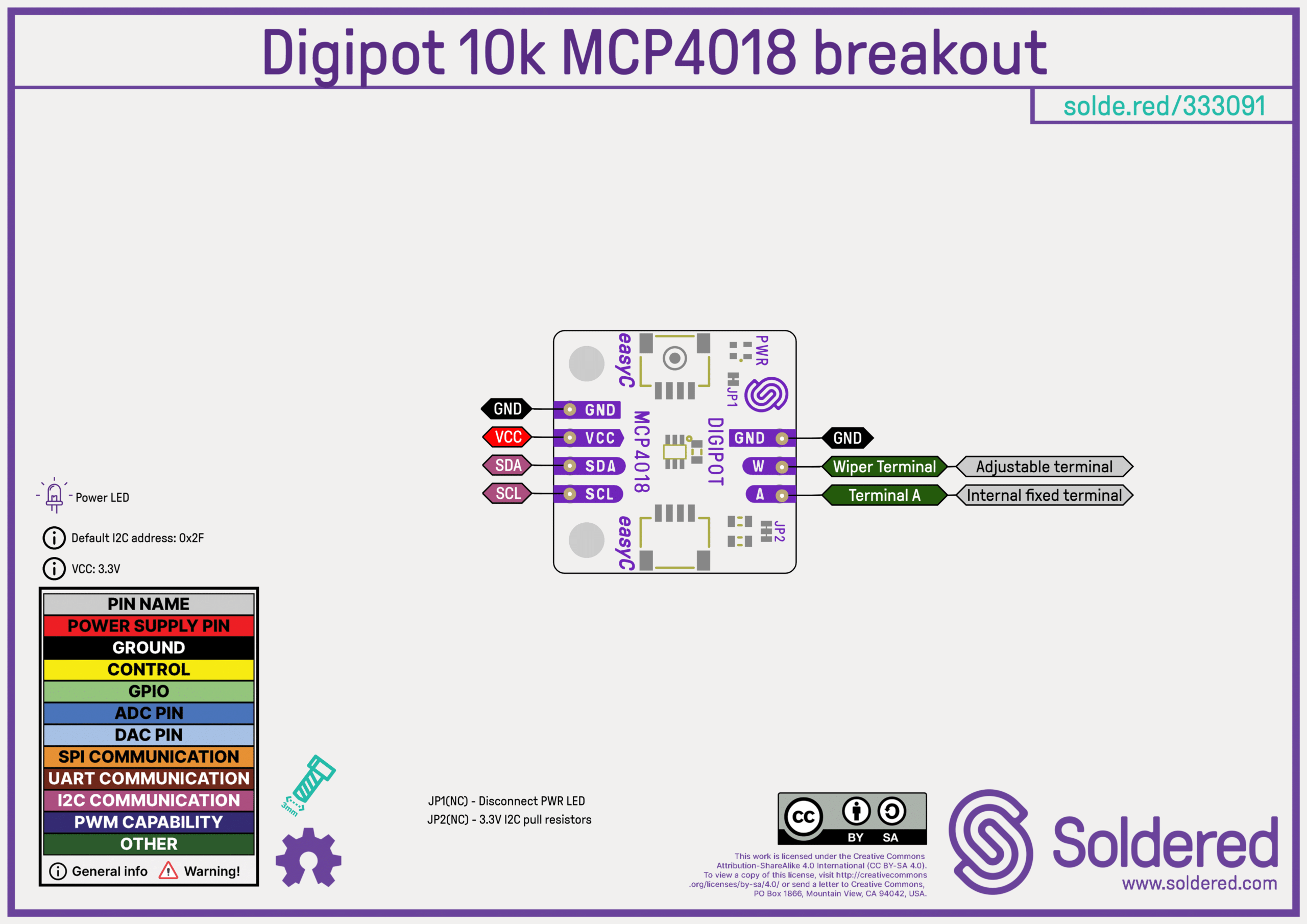 Our module is based on the MCP4018 IC which has a total of 128 steps between 0 and 10k resistance values. This would mean that it is capable of doing resistance steps of approximately 78ohms. It is controlled via I2C which makes it extremely easy to use.