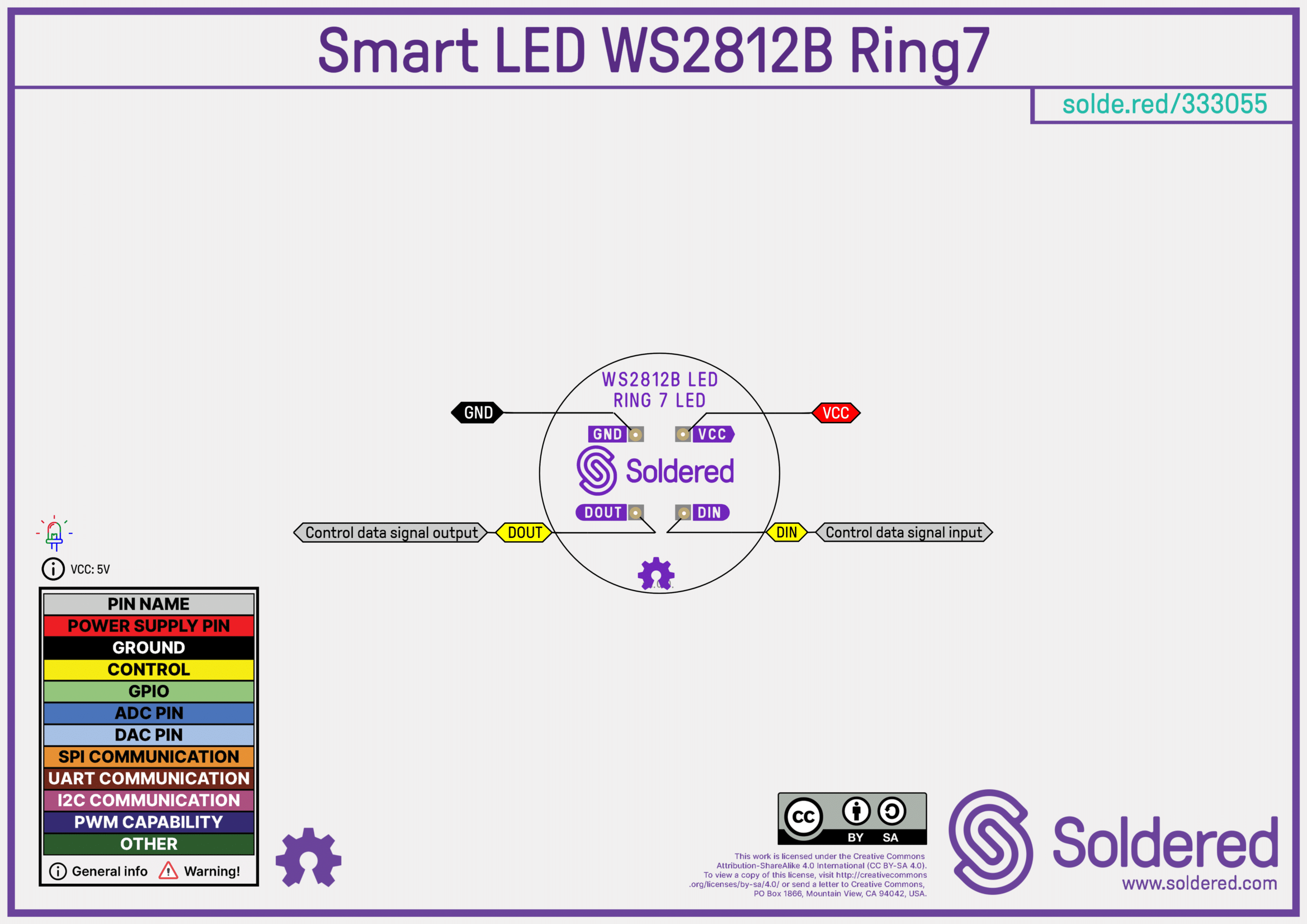 WS2812B is an extremely interesting LED that can emit light in red, green or blue - or any combination of these three colors, able to show a total of approximately 16 million different colors. On this board, diodes are arranged in a circle. They are controlled by a single pin with only a few lines of code from Arduino IDE. That's possible thanks to the integrated controller inside the LED itself!