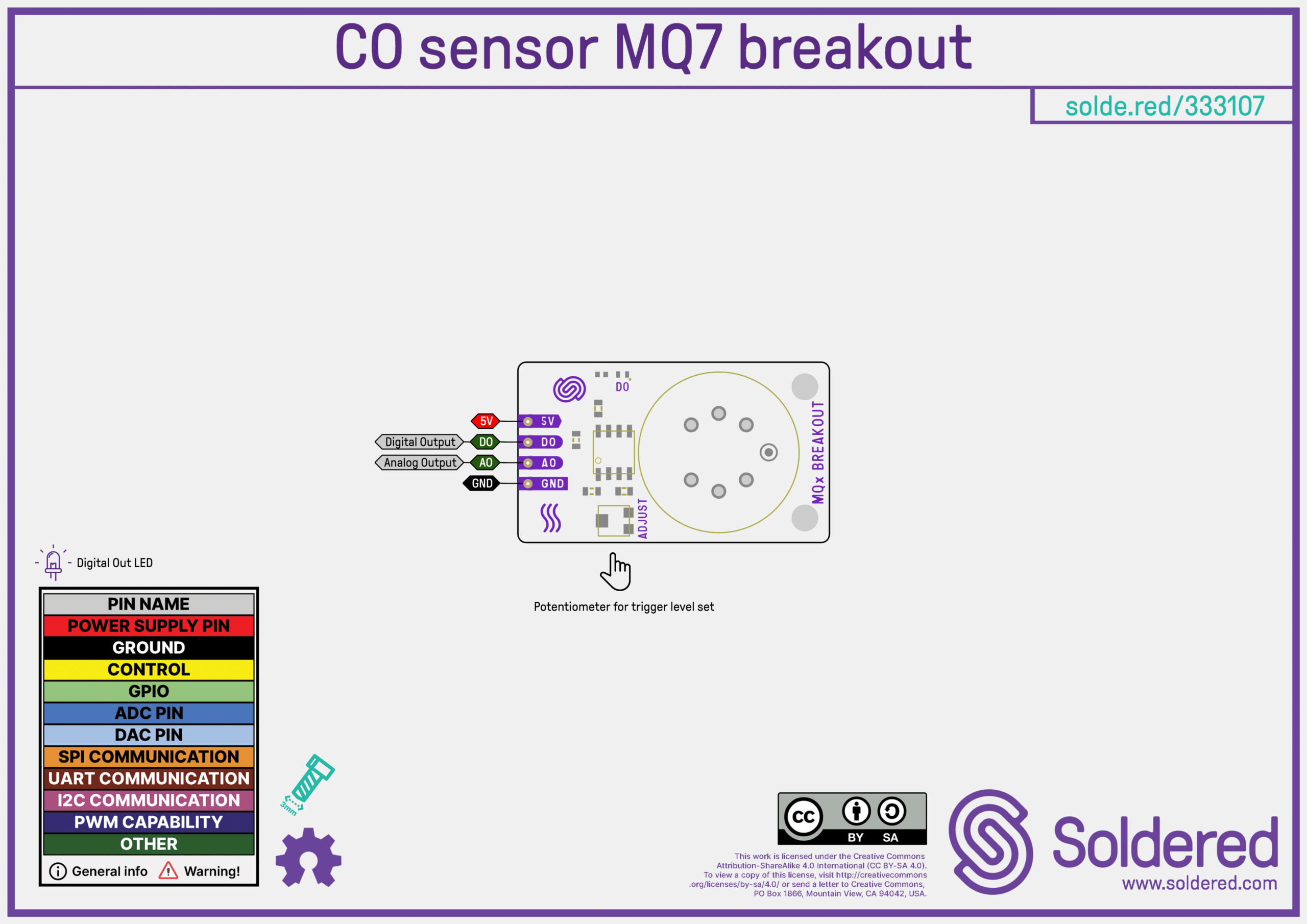 Die breakout Platte arbeitet mit digitalen (DO) und analogen Signalen (AO). Digitalen Output bekommt man mit der Installierung der Grenzwerte mit dem Potentiometer. Der analoge Output variiert je nach Gasintensität um den Sensor herum.