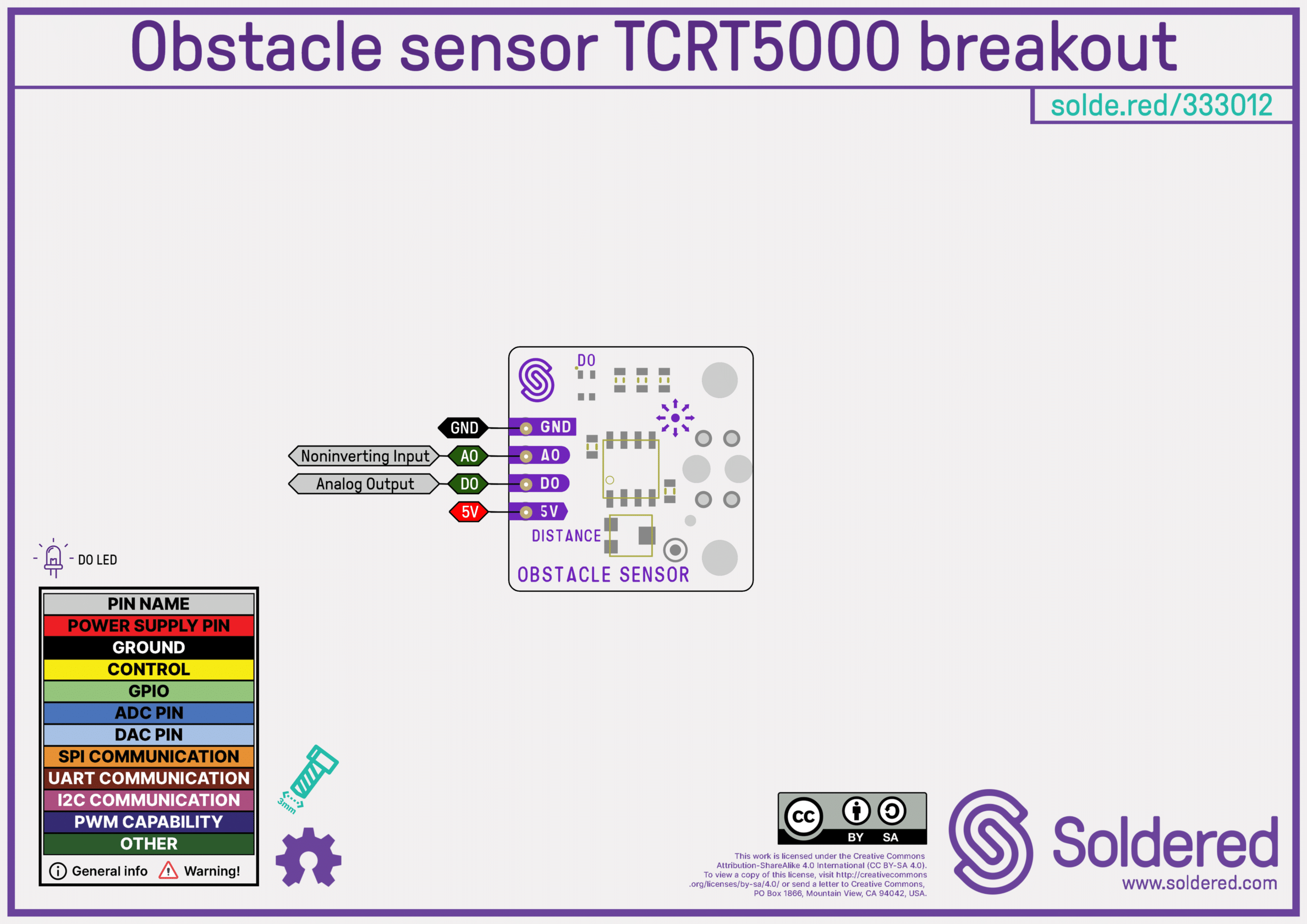 Senzor prepreke, baziran na TCRT5000, koristi infracrvenu ledicu i primjemnik kako bi detektirao prepreke pred njime. Na pločici se nalazi komparator napona te podešavanjem potenciometra možemo dobiti digitalni izlaz, ovisno o blizini prepreke. LEDica DO na ploći također će indicirati da je digitalni izlaz aktivan. Dostupan je i analogni izlaz u slučaju potrebe za preciznijim podatkom. Senzor vrlo dobro služi i za praćenje crte u projektima robotskih kolica.